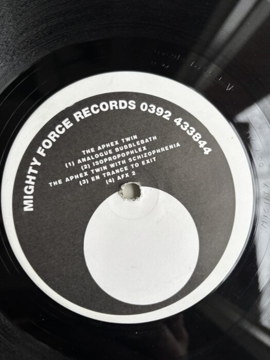 First press commercial edition. The present copy corresponds to the original first pressing, notable for the unprinted, unstamped white label on the B-side and the miscrediting of the track “AFX” to “Schizophrenia,” a documented early anomaly associated with this release.